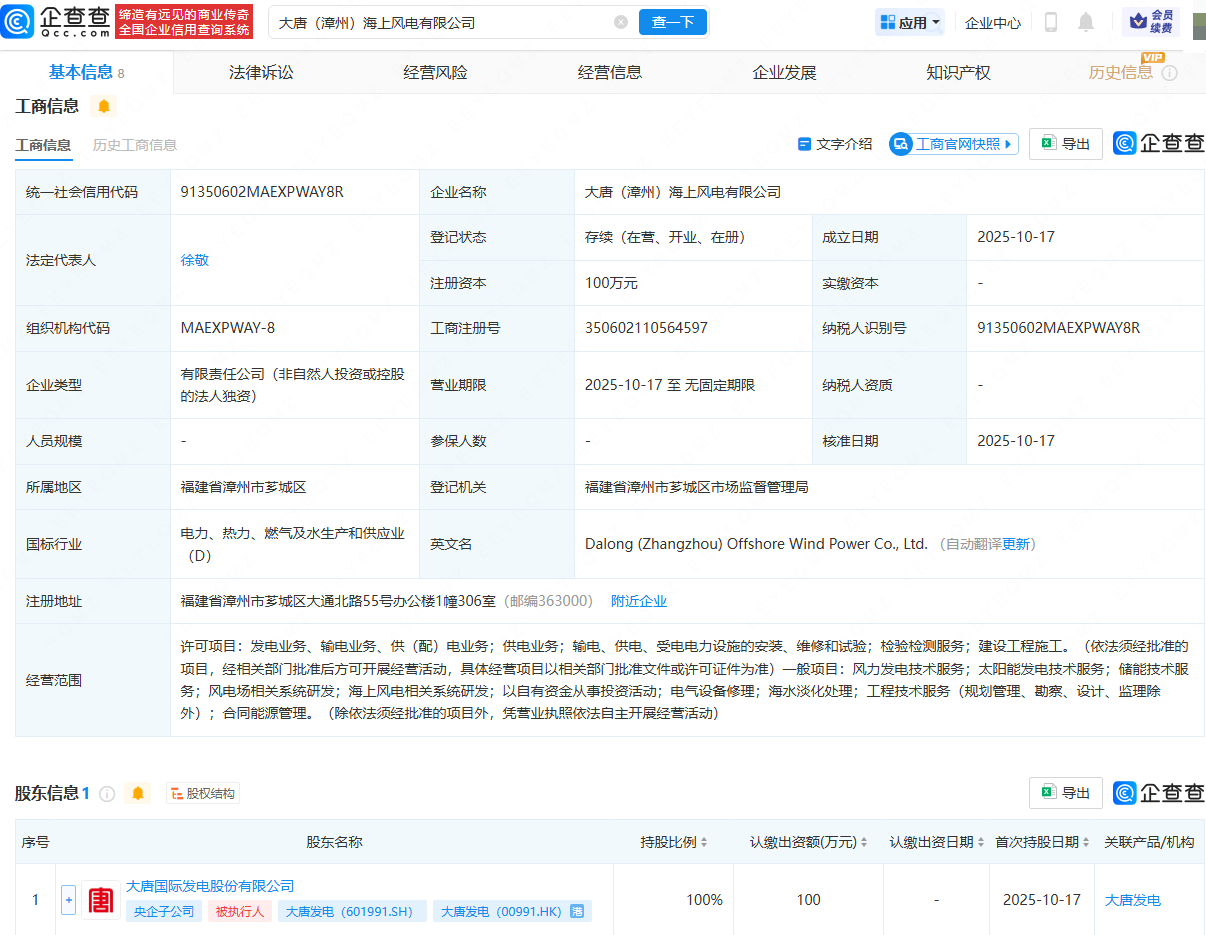 近日,大唐(漳州)海上风电有限公司成立,法定代表人为徐敬手机炒股配资软件,经营范围包含:发电业务、输电业务、供(配)电业务;供电业务;风力发电技术服务;太阳能发电技术服务;海上风电相关系统研发等。企查查股权穿透显示,该公司由大唐发电(601991)全资持股。