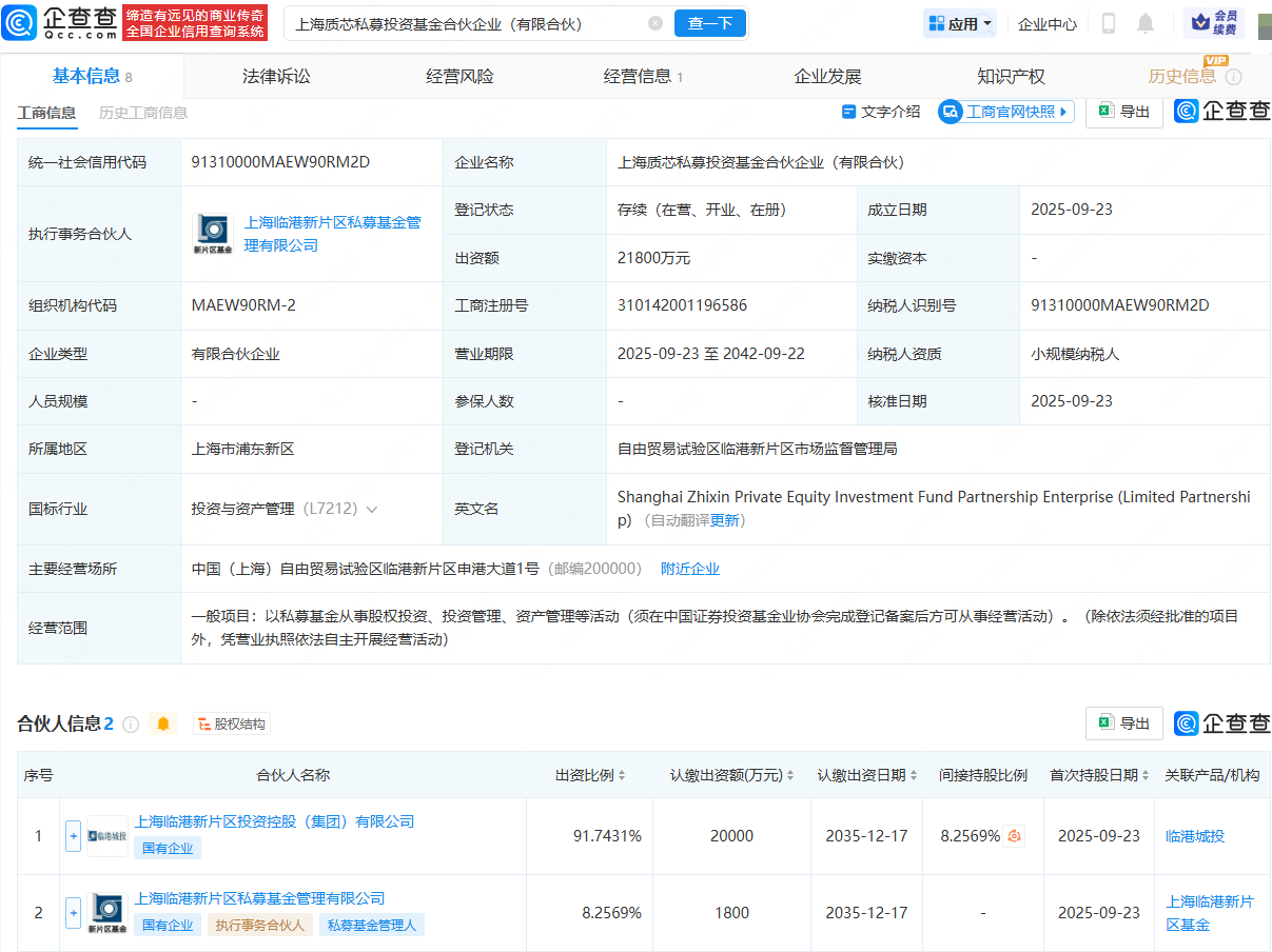 近日全国前三配资排名,上海质芯私募投资基金合伙企业(有限合伙)成立,出资额2.18亿元,经营范围包含:以私募基金从事股权投资、投资管理、资产管理等活动。企查查股权穿透显示,该合伙企业由上海临港新片区投资控股(集团)有限公司、上海临港新片区私募基金管理有限公司共同持股。